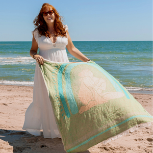 This beauty is SolWoven’s bestseller for a reason — soft, sustainable, and absolutely gorgeous. With a classic flat weave and subtle multicolored threads woven throughout, it’s rich in texture and charm. Another perk is how versatile it is — use it as a towel, wrap, shawl, yoga companion, or even a throw. It’s one of those rare finds that feels timeless and functional in all the best ways.